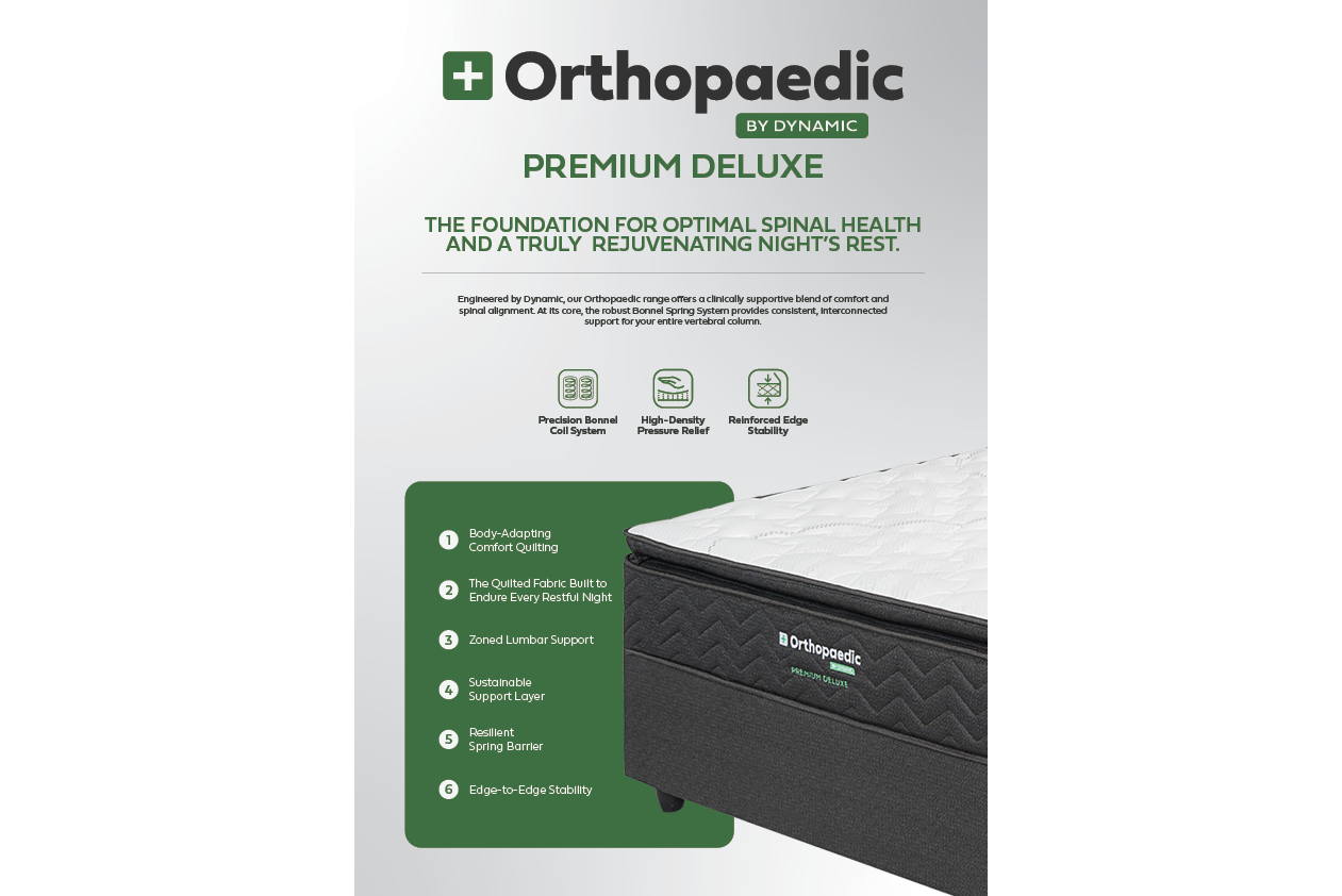 The Orthopaedic Premium Deluxe is a medium-feel orthopaedic spring mattress for back pain with 3-zone lumbar support and 10-year warranty. 100 kg per side. Single to King.