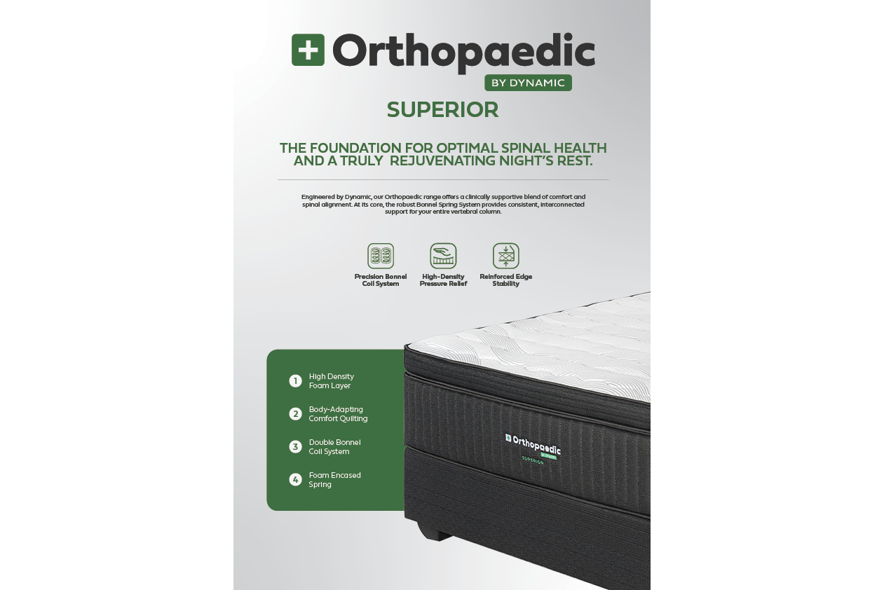 The Orthopaedic Superior is a double Bonnell coil mattress for heavy sleepers, rated 120 kg per side with 15-year warranty. Medium feel, foam-encased springs. Double to King.