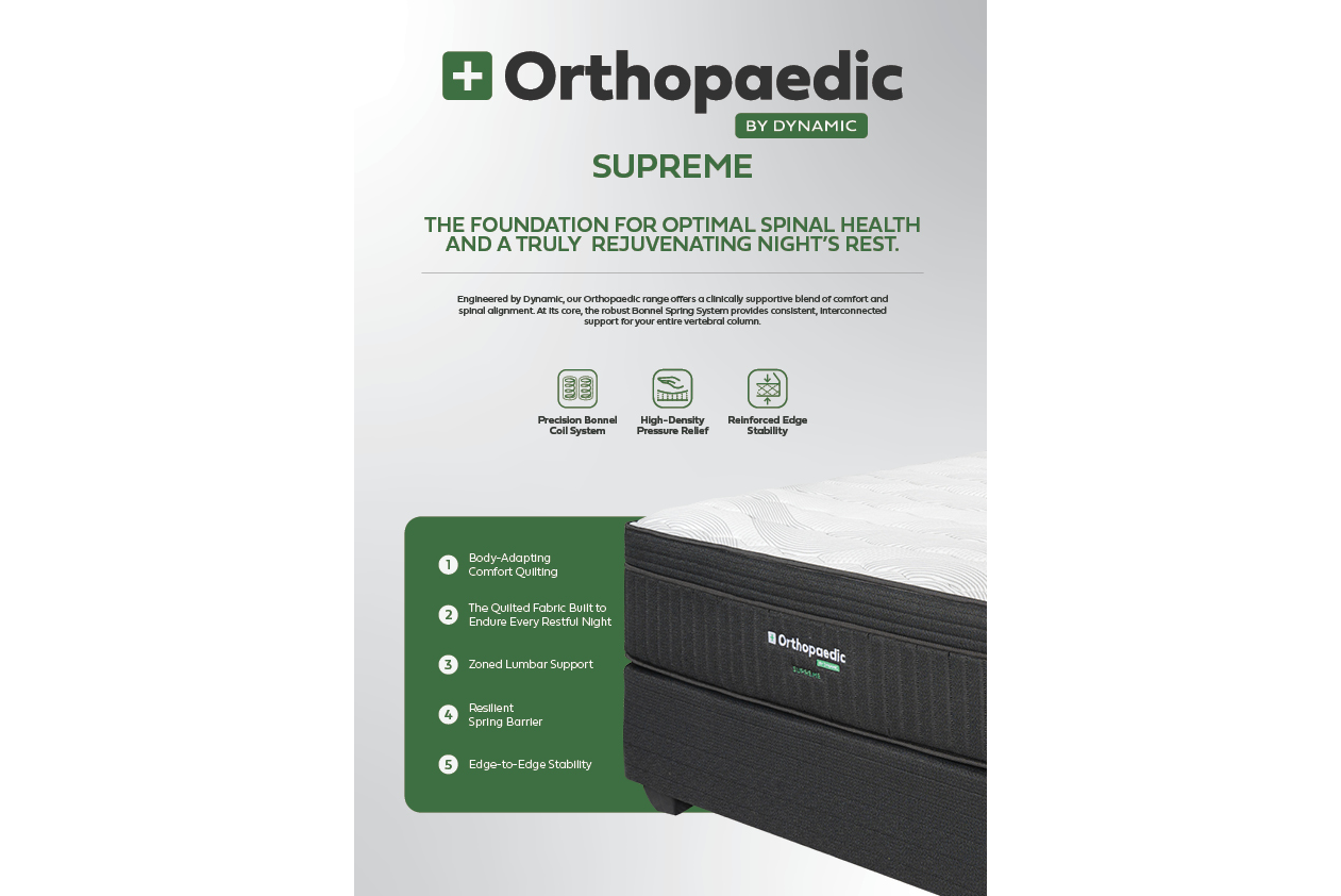Orthopaedic back support in a more accessible medium comfort feel the Orthopaedic Supreme is the ideal choice for people who need 3-zone lumbar alignment and precision Bonnell coil support, but prefer a slightly softer sleep surface than the Supreme Firm. Available in Double, Queen, and King with a 12-year warranty, this medium-feel orthopaedic bed for back pain suits a wide range of sleeping positions and body types from side sleepers needing hip pressure relief to back sleepers who need consistent lumbar support.