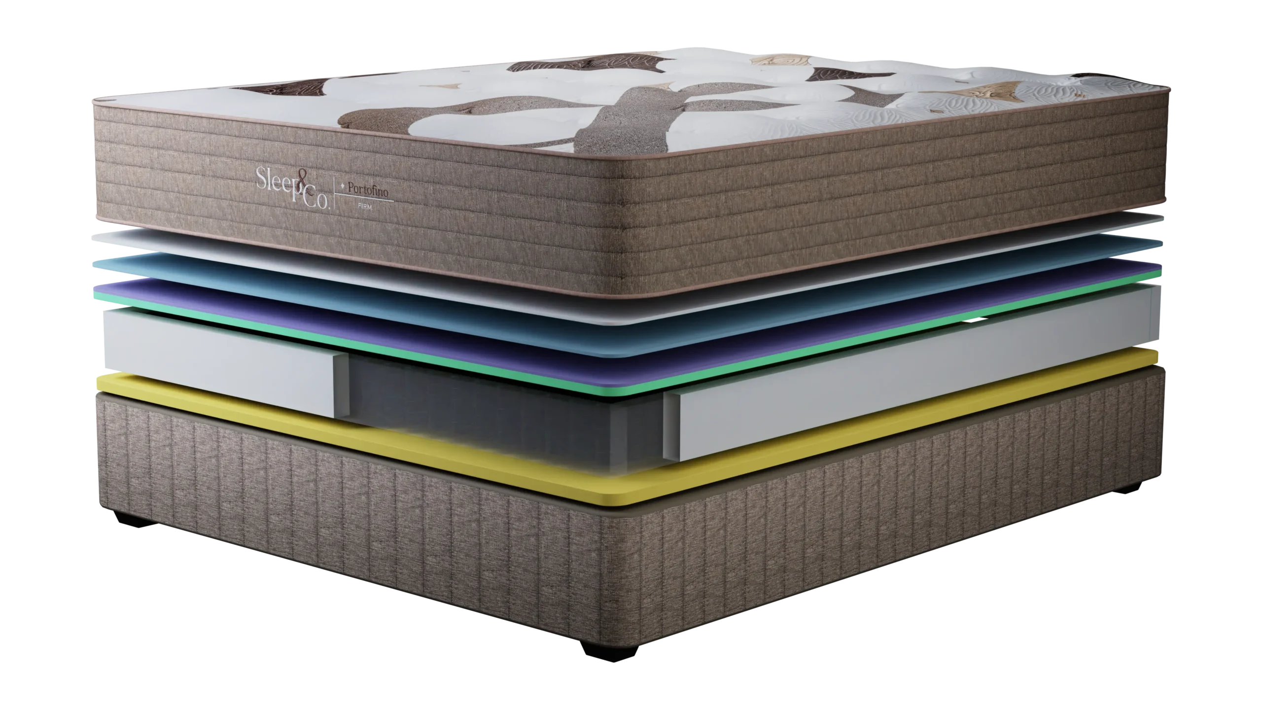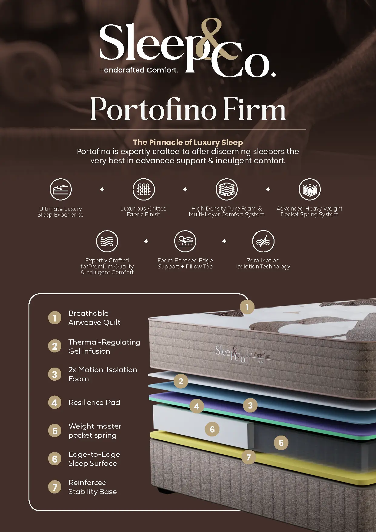 The Sleep & Co Portofino Firm is a luxury firm mattress for heavy people — Weight Master pocket springs, thermal gel cooling, dual motion isolation, pillow top. 120 kg per side. 12-year warranty.